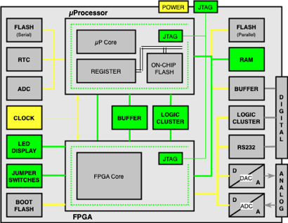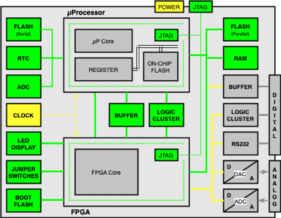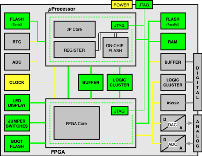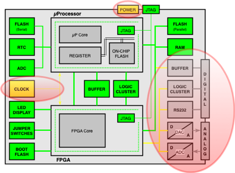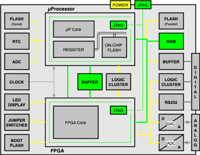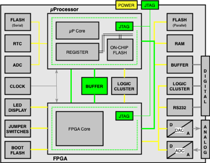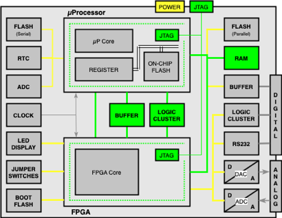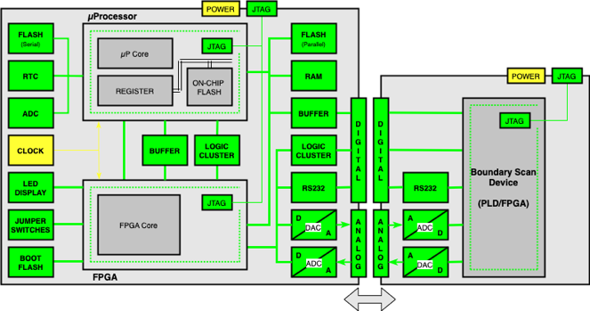 including two Boundary Scan Devices, - one µProcessor and one FPGA - and several Non- Boundary Scan Devices and different types of Interfaces (POWER, JTAG, DIGITAL, ANALOG)
